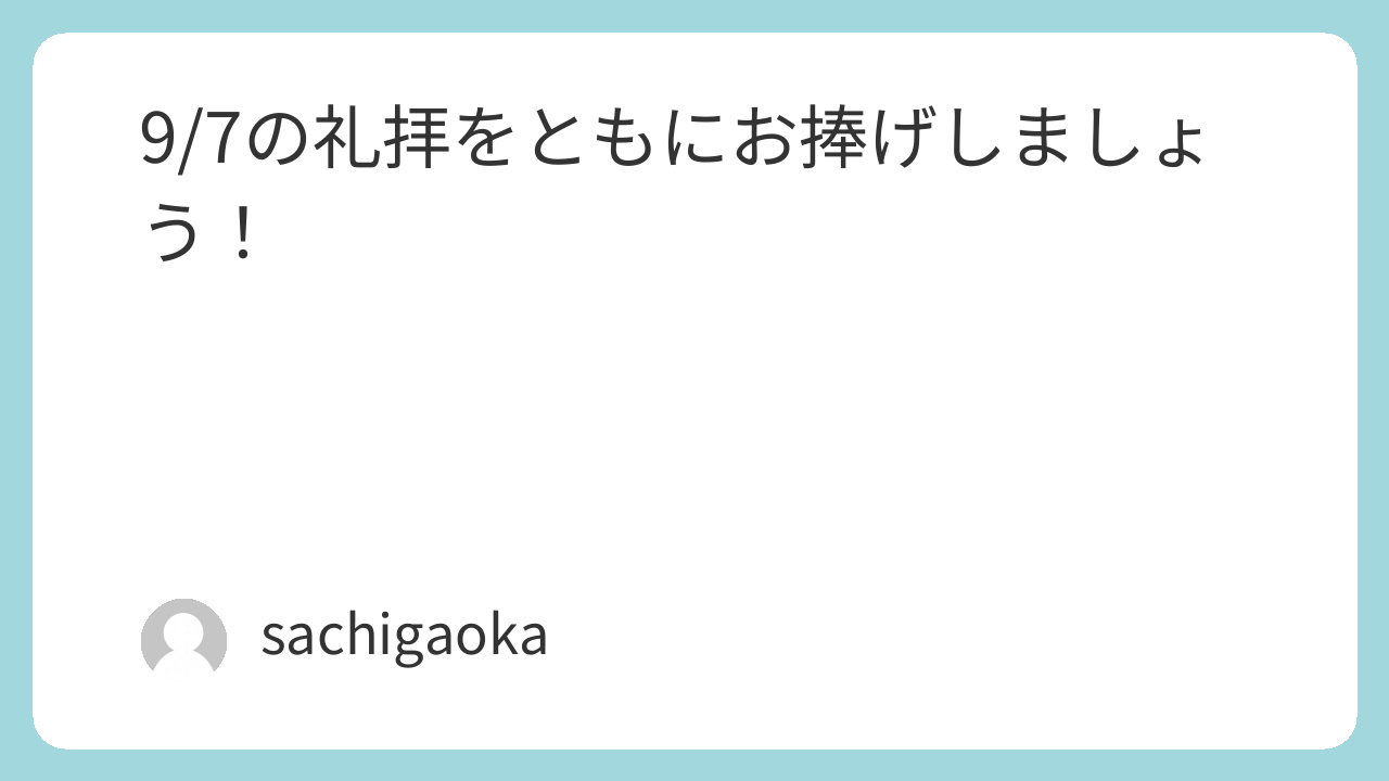 9/7の礼拝をともにお捧げしましょう! 礼拝 X Facebook はてブ LINE コピー 2025.09.07 日曜日の礼拝はYouTubeにてライブ配信も行っております。配信時刻は午前10時30分からとなります。時間になりましたら、下記URLからぜひご覧ください。